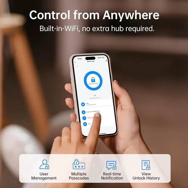 Remote Control & Alerts: With 2.4G WiFi(no hub required), you can manage your wifi door lock from anywhere via APPlock/unlock, grant temporary access, monitor entry logs, whether you're at work or traveling, stay in complete control of your home's security.