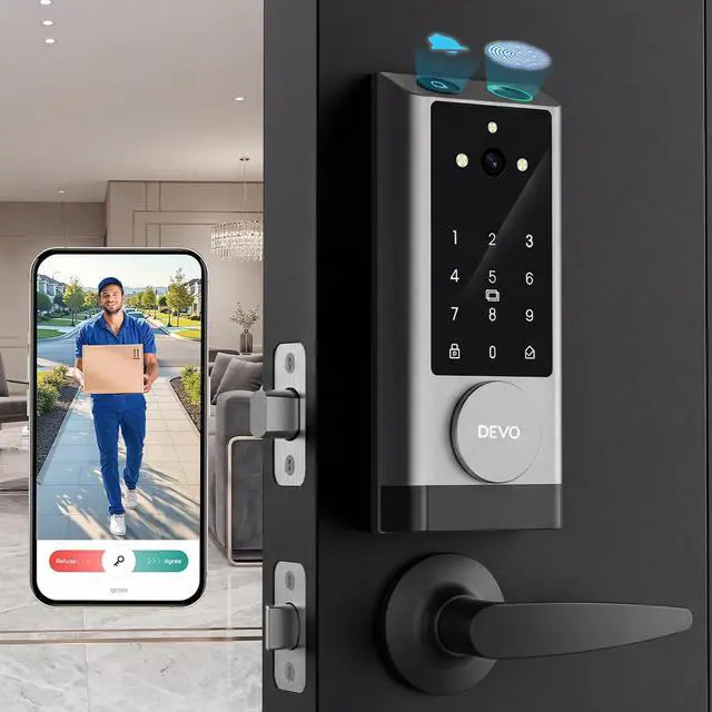 [6-in-1 Smart Lock with Camera & Doorbell] The DEVO G1 Security System integrates a biometric fingerprint door lock, an FHD camera with dual-laser infrared night vision, and an adjustable-volume video doorbell. This deadbolt lock offers 6 keyless entry methods: fingerprint, app control, voice control (compatible with Alexa and Google), IC card, keypad codes, and physical keys. This versatile solution provides 24/7 security for your home, office, or apartment.
