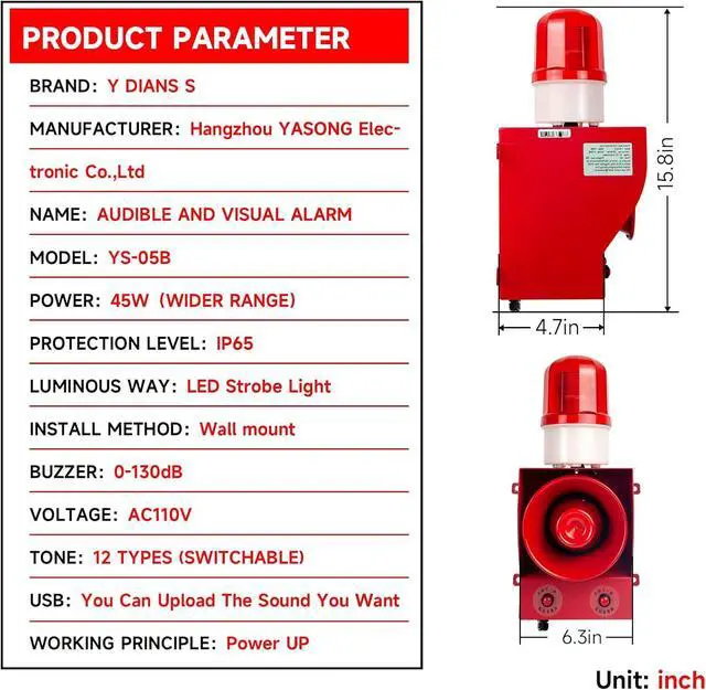 Adjustable sound and tone 0-130dB adjustable alarm, you can select the volume according to your own needsShort press the siren button to adjust the sound level of the alarm; The alarm has 12 built-in tones, you can choose your favorite tone through the button (long press the siren button to switch the built-in tones); There is also USB port available, you can upload your own sound to the siren.Then the audio motherboard inside the alarm will play your music as warning tones.