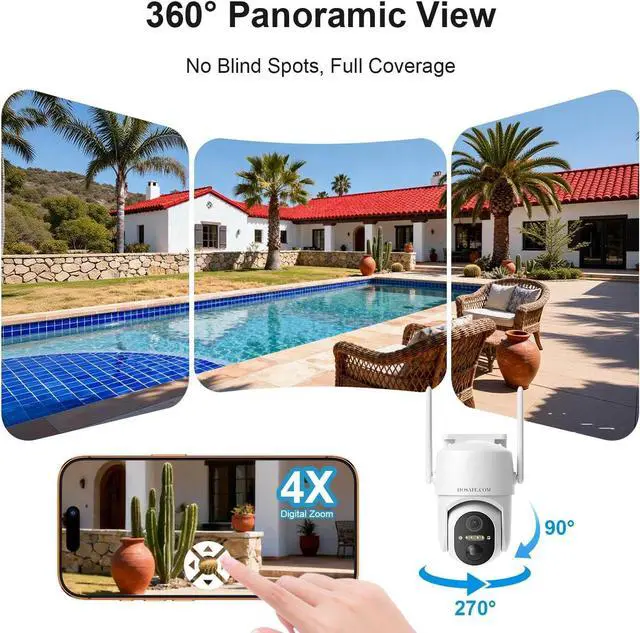 Pan 355° and tilt 90° with 4x digital zoom to get perfect view; Color night vision provides clear images in darkness