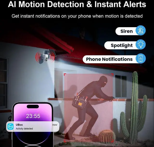 Instant alerts with siren alarm when motion detected; Remote live view and 2-way talk through phone app anytime