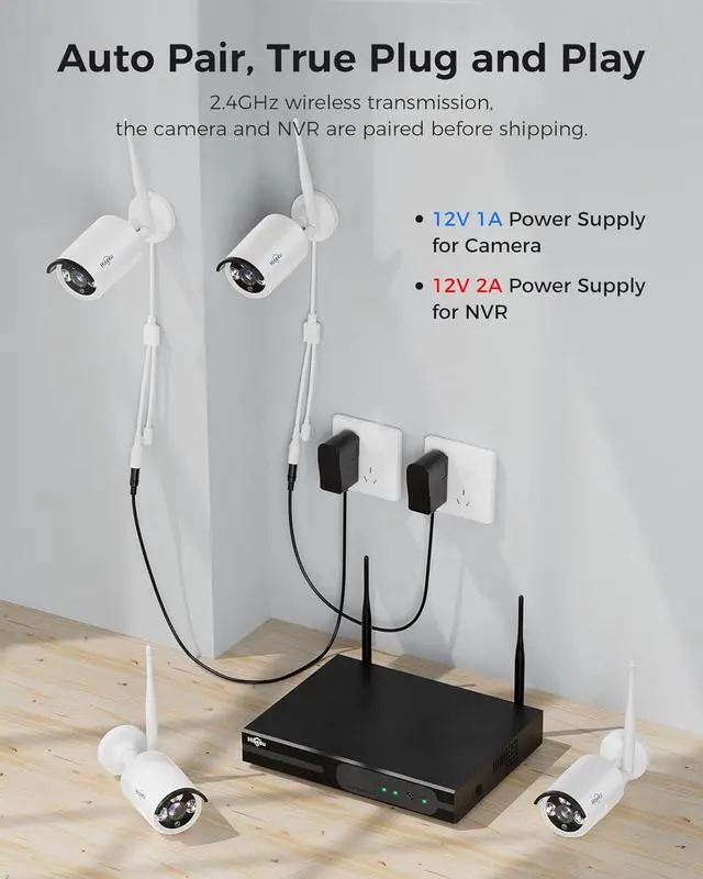 Wired Plug-in Powered, 24/7 Recording Hiseeu security camera system, 24/7 wired powered of cameras and NVR support 24/7 recording, no dropouts or battery hassles. 3 recording modes (24/7 recording, motion-triggered recording, or customized recording ), total flexibility