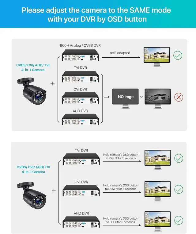 Built in OSD Menu-- It comes with OSD Menu which can change 4 different video output. 1080P AHD, 1080P CVI, 1080P TVI and 960H CVBS. Default Video mode is 960H mode, compatible with all analog DVRs. 1080P video mode must be switched according to your 1080P DVR type.