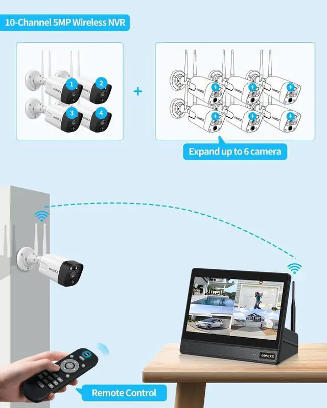 {130° Ultra Wide-Angle Lens Equipped} Optical wide-angle lens with multi-layer lens, provides you about 130° wide viewing angle and reduces dead ends of surveillance areas. {2-Way Audio & Family Sharing} You can keep in touch with your family when you miss them and want to talk to them anywhere and anytime. This security camera supports multiple users (up to 4) to view streaming video simultaneously. You can remotely live view or chat by high-quality two-way audio via APP. Just download the free Eseecloud APP from APP Store (IOS) or Playstore (Android) on smart-phone. {Dual Antennas Enhance WiFi} The wireless signal is very important for this system. If the wireless signal is weak, the video will be blurred/stalled/disappeared, so we will update all cameras to real dual antennas. The wireless distance will be updated by about 55%, and the video will be even better. Smooth and clear. {3K 5.0MP High Definition} The 5.0 Mega Pixel (2592 x 1944) High Definition security camera ensures the more safety of people and homes for 24/7 hours. Everything within 80 feet can be seen even at night. It is equipped with an IR-LED system, automatically activates the infrared mode in low lighting conditions. {PIR & Smart AI Two-Way Detected} With the help of advanced recognition algorithms and Infrared Detectors, OOSSXX will send notifications in real time once abnormal actions. Compared with the Motion detection, Two way Detected avoid 99% False Alarm by leaves, cloud, animals or insects. {Free APP No Month Fee} Download the free app " Honestview" from App Store on your smartphone. With an internet connection, you can watch the videos remotely from anywhere on your phone (IOS&Android), PCs, or tablet.