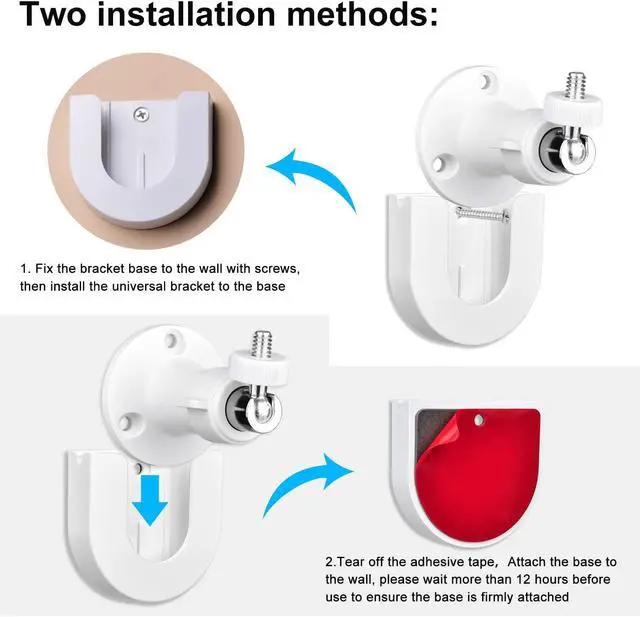 Two way installation methods: Two methods for you to choose, use screws or adhesive tape to fix the wall mount holder, Please make sure the wall is smooth and flat if using self-adhesive tape mounting and wait at least 6 hours to install the Ring Indoor Cam to make the tape closely attach to the desired surface