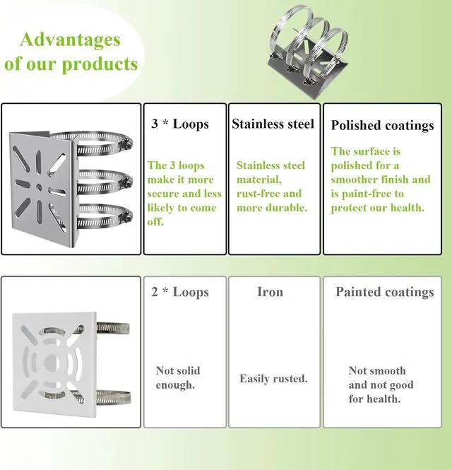 Easy to Install: Fix your camera on the vertical pole mount adapter, put the loops through the holes on the back of the bracket, tie it to the vertical or horizontal pole, and then tighten the screws to the right size