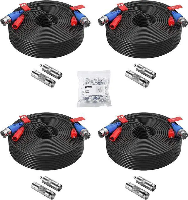 Package Content 4 x 100ft TVI BNC & Power CCTV Video Power Cables, 4 x BNC to BNC connectors, 4 x BNC to RCA connectors, 1 x Cable Clip Kit (100pcs)