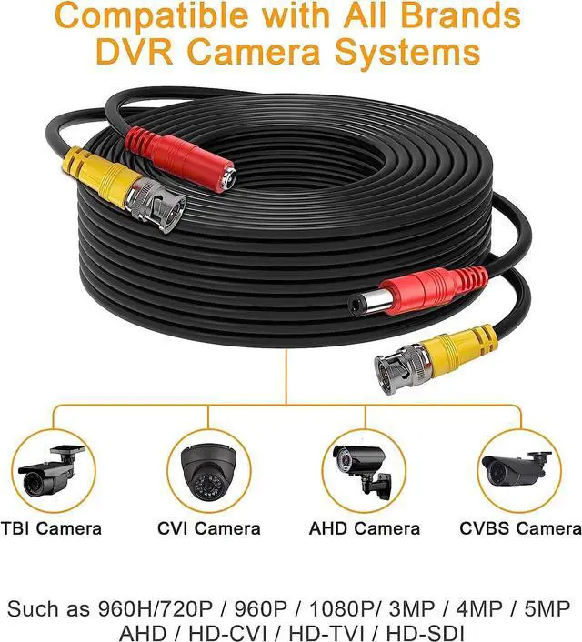 Strong compatibility; the 4x200ft BNC power and video extension cable is compatible with all brands of CCTV surveillance DVR camera systems, such as 960H, 720P / 960P / 1080P, 3MP / 4MP / max 5MP, AHD / HDCVI / HD-TVI / HD-SDI