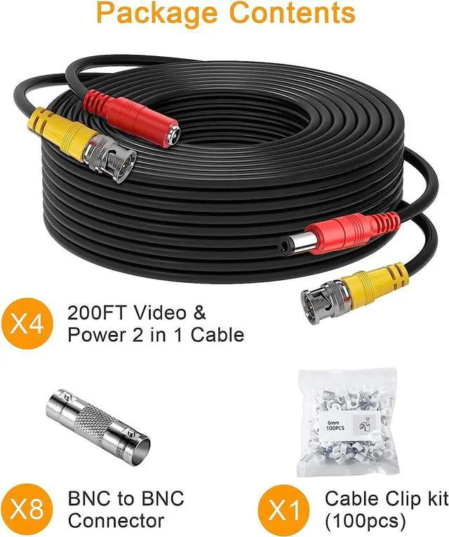 Easy to use; The camera wire has a 200ft prefabricated, multi-purpose conjoined cable, including 8pcs BNC female-to-BNC female connectors and 1xCable Clip Kit (100pcs), suitable for indoor and outdoor, plug and use
