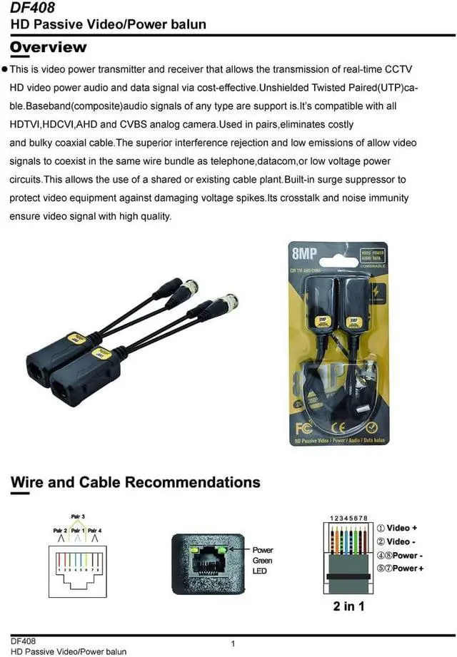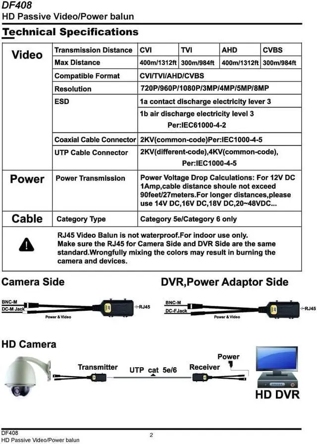 Video/Power transmission Via UTP CAT5/5E/ 6Only used for Category 5/Category 5E/Category 6 Cable. We provide a specification which has detailed installation steps make the procession of installation simple and convenient.