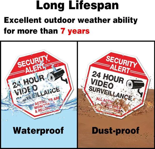 Long lifespan: All security signs are through dust and water proofing technology, these Video Surveillance signs can withstand extremely bad weathers, Excellent outdoor weather ability for more than 7 years