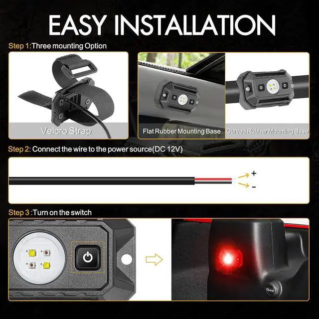 EASILY INSTALL AND REMOVE: The universal LED dome light is available in an adjustable Velcro strap and two types of rubber mounting pads. You can choose different methods to mount the dome light, depending on your needs. Such as, using the flat and curved mounting pads on the flat and curved place respectively, or using the Velcro strap on the roll cage or roll bar within 4 inch diameter not need additional tools