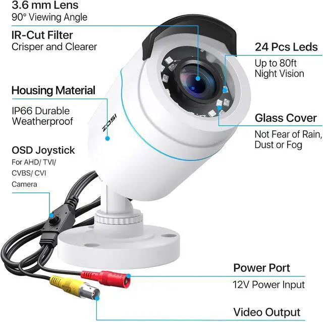 [ IP66 Metal Weatherproof ] __ Camera used high quality metal aluminum materials, 3-Axis camera stand, cable through bracket for hassle free use in rainy or snowy days. Camera Power Supply and Coaxial Video Cables are not included but they are required and sold separately.