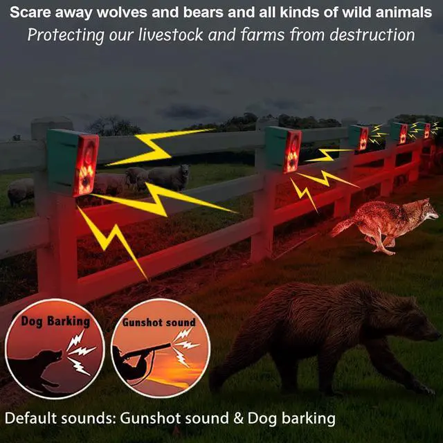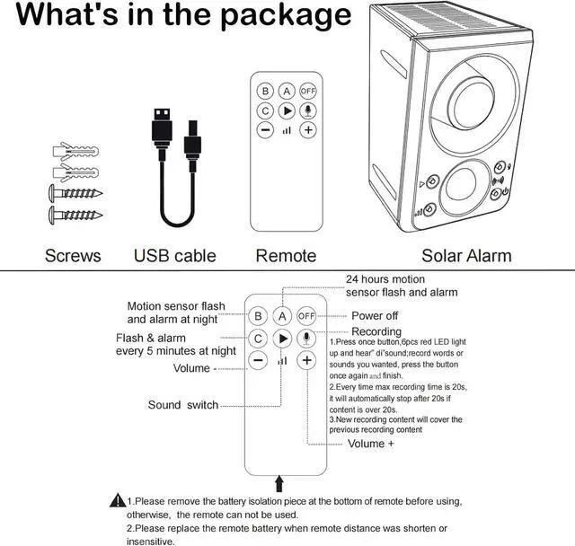 Integrated sensor alarm with new technologyRecording and setting volume - The new upgraded solar outdoor motion sensor alarm allows you to record your own alarm sound or choose between the default dog barking & gunshot sounds. The ±volume function gets the desired effect in different scenarios.