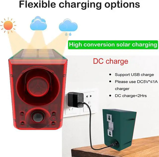 Advanced solar power combined with USB port charging dog barking alarm motion detector will work non-stop while the solar power is charging, maintenance-free and easy to install.