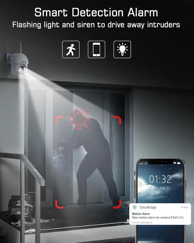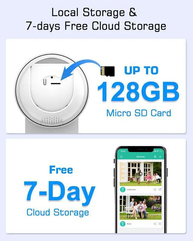[Smart Alerts & 2 Storage Options] Receive real-time alerts on your mobile app when motion is detected. The camera offers 3 alarm types: siren, spotlight, and app notifications. Footage is stored on a microSD card (up to 128GB, not included) or cloud storage with a 7-day loop coverage (6-second clips). AI analysis identifies people, pets, vehicles, and parcels for more relevant alerts (Paid Plan).