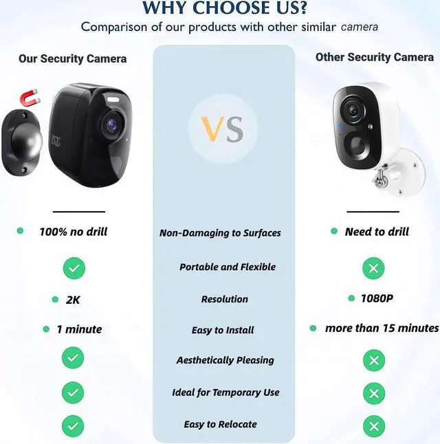 Two installation methods: new magnetic installation or ordinary bracket installation. The magnet is strong and won' t fall off. The installation is so easy. Magnetic installation does not require drilling, so it will not damage the wall (Note: This outdoor camera only supports 2.4G WiFi)