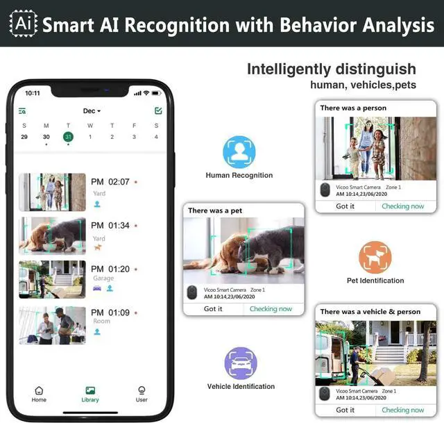 Full Color Night Vision & PIR Motion DetectionThe battery powered security cameras have two modes for night vision: Full-color night vision and infrared night vision with 33ft visible range, helping you take excellent color pictures and videos at night. Bullet surveillance cameras adopt an advanced PIR sensor to catch any suspicious events in its detection range. It can accurately identify and differentiate between people, pets, vehicles, and packages through smart AI technology