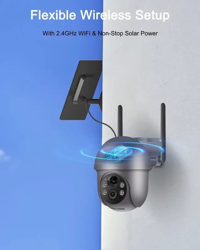 View: The 5MP PTZ solar camera take a 355° horizontally and 140° vertically panoramic shooting and 4X digital Zoom (No optical zoom), make sure cover your target area without blind spots. Surveillance cameras show you everything in 5MP HD. Great IR night vision in darkness as well as 2.5K Color night vision enabled by 4 powerful spotlights, covering every corner more comprehensively and intuitively.