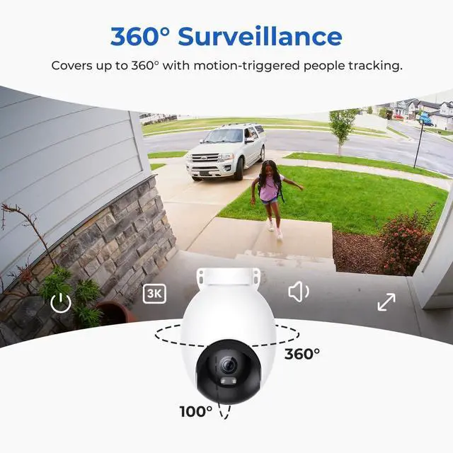 Time: This home security camera provides a 360-degree view of your outdoor area up to 30 feet away in sharp 3K HD. A low-light enhancer catches six times more light for colorful night vision