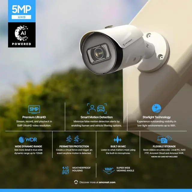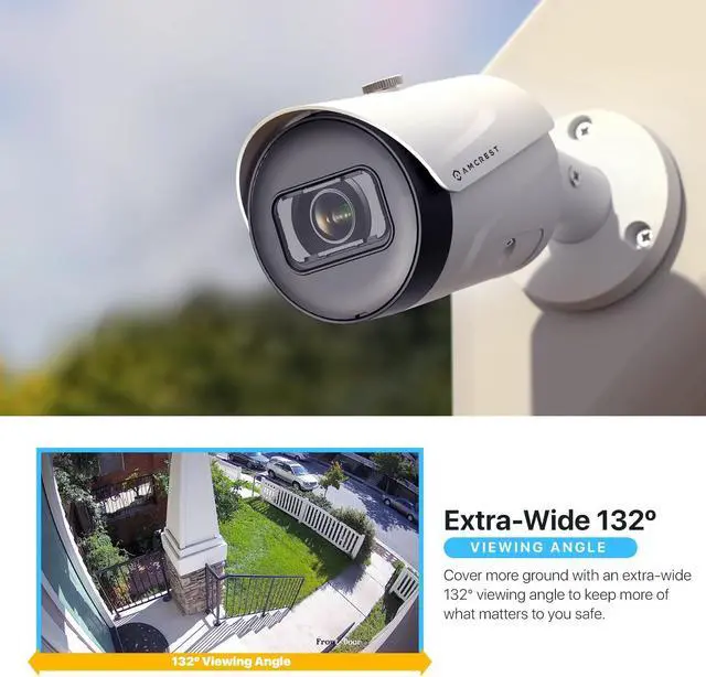 AI FEATURES AI Bullet PoE IP Camera features Human & Vehicle Detection, IVS (Tripwire, Intrusion Detection) which triggers an event anytime a human or vehicle crosses the defined area (prevents false alerts). Stunning 5-Megapixel 2592 x 1944p video resolution with enhanced low light capability on this POE outdoor camera utilizing an CMOS progressive image sensor., 5-Megapixel @20fps video with a super-wide 132° viewing angle. PoE injector or switch required; not included, sold separately. Works with Alexa through AmcrestCloud.