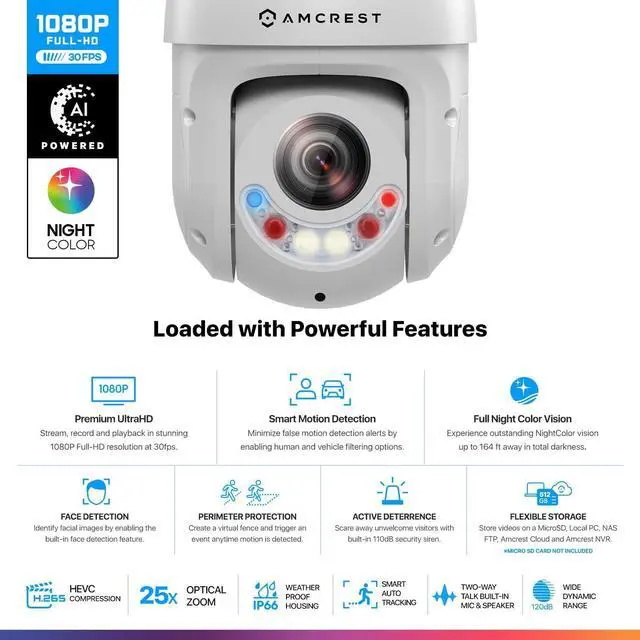 Smarter, Safer, Security - Utilize intelligent alerts that send notifications to your computer or smartphone via the Amcrest View app. Record events on this PTZ POE + camera as soon as they happen and store them on your computer, MicroSD (up to 256GB), NAS, or Amcrest Cloud. This camera requires PoE+ power (802. 3at) in order to operate. Utilize the pan tilt zoom feature with 25x optical motorized zoom as well as continuous 360° pan, 90° tilt capturing every angle.