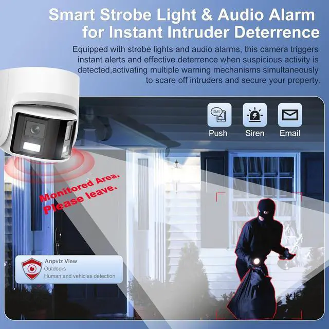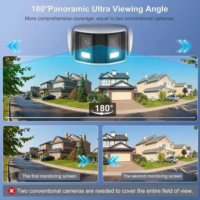 Motion Detection 2.0 and Strobe light & Audible Warning: Equipped with person and vehicle detection, this dual lens security camera can differentiate between objects to prevent false alarms. When motion is detected, in addition to sending push notifications to your phone, the camera also has flashing lights and speakers to alert people and cars that they are being recorded.