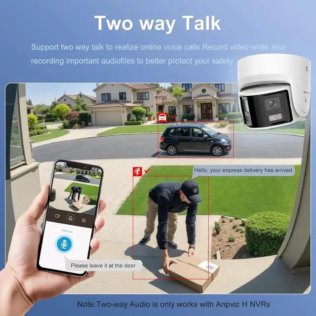Two-Way Talk: The 6MP 180-degree security camera features a built-in speaker and microphone, allowing you to communicate with visitors or potential intruders. You can warn them to leave your property or answer the doorbell remotely, no matter where you are.