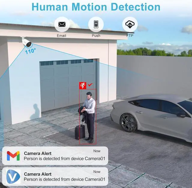 IR Night Vision: This 5MP (2560x1290) 25fps PoE IP camera supports a 65 to 98ft long distance infrared night vision range and ultra-wide 108 viewing angle, captures crystal clearer and sharper images and video, which is great for driveway, hallways, etc.