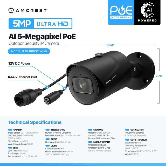 AI FEATURES AI Bullet PoE IP Camera features Human & Vehicle Detection, IVS (Tripwire, Intrusion Detection) which triggers an event anytime a human or vehicle crosses the defined area (prevents false alerts). Stunning 5-Megapixel 2592 x 1944p video resolution with enhanced low light capability on this POE outdoor camera utilizing an CMOS progressive image sensor., 5-Megapixel @20fps video with a super-wide 132° viewing angle. PoE injector or switch required; not included, sold separately. Works with Alexa through AmcrestCloud.