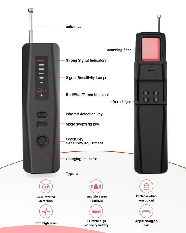 5-in-1 Hidden Camera Dtector: Spy camera detector Combines signal detection, strong magnetic detection, infrared camera positioning, and night vision light detection. Accurately locates eavesdropping devices, GPS trackers, and hidden cameras, making it suitable for various scenarios and providing comprehensive protection for your privacy and security.