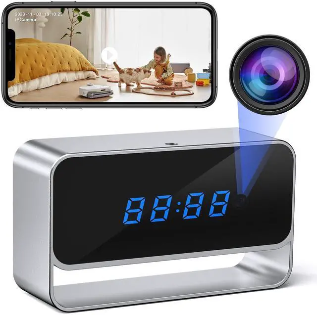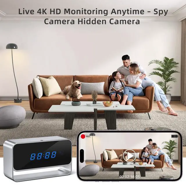 This hidden camera clock records clear 4K video with wide-angle view, night vision, motion detection, and remote access via mobile app.