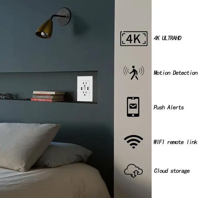 Power Hub Functionality: This smart wall socket camera doubles as a power hub, offering 2 AC outlets and 2 USB ports (5V/2.4A) to keep your devices charged while maintaining security.