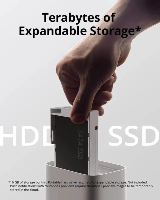 Local Expandable Storage: With this local 4K security camera system, you're in control of your own data with military-grade encryption. 16 GB built-in storage with the ability to expand up to 16 TB with a portable hard drive* (not included) - store a lifetime of videos, all for no monthly fee. *Please go to FAQ for hard drive specifications and requirements.The operating system will occupy a portion of the built-in storage capacity.