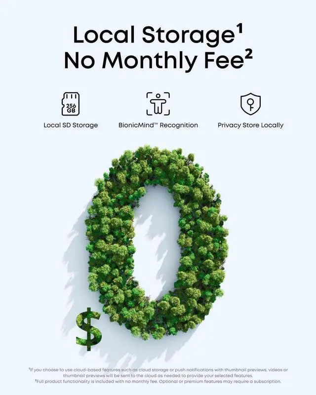 Local Security, No Monthly Fee: Store footage locally on a microSD card, supporting up to 256 GB for secure storage with no monthly fee. The camera itself also supports a separate microSD card slot (up to 256 GB) for direct local recording. Note: microSD card not included.
