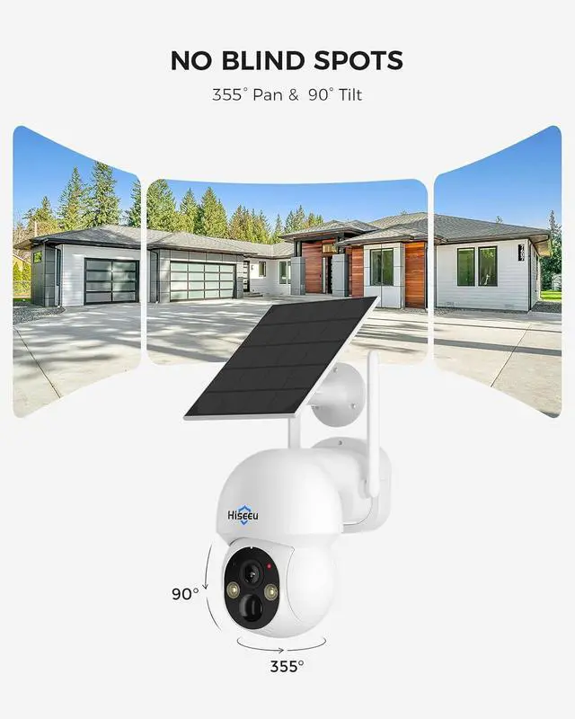 360° No Blind Spots & Remote Viewing: Our solar security camera system supports pan (355°) and tilt (90°), providing all-around protection for your home. No matter what is happening or where you are, you can remotely view your family and property with the wireless solar camera kit