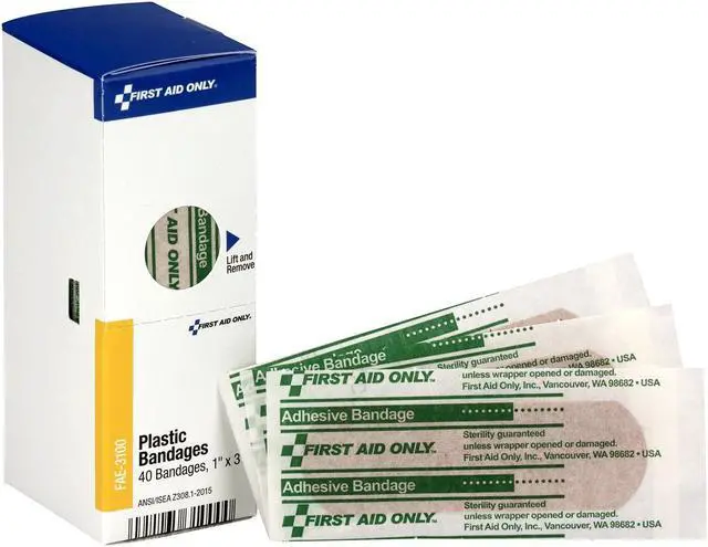 Convenient refills contain individual items for restocking first aid kits. For general use around office or home. For SmartCompliance System. Number of Pieces: 40; For Use With: First Aid Only 90732, 90829, 90830, 90831, 90832, 90833, 90834; Material(s): Plastic; Quantity: 40/Box.