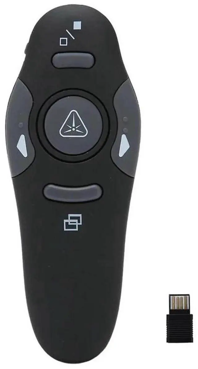 Designed for comfort and simplicity, this wireless presenter features an ergonomic shape with a sleek black body and dark gray buttons, reflecting a minimalist design philosophy. Ideal for PowerPoint, Keynote, and Google Slides presentations, it's perfect for classrooms, offices, conferences, speeches, and more.