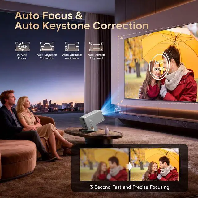 4. Auto Focus & Auto Keystone Correction & Auto Obstacle Avoidance & Auto Screen Alignment: This proyector features fully automatic keystone correction for perfectly aligned visuals in seconds. It intelligently recognizes the screen and adjusts the image to fit preciselyno more manual corner dragging. With smart obstacle avoidance, it ensures an uninterrupted, immersive viewing experience every time.