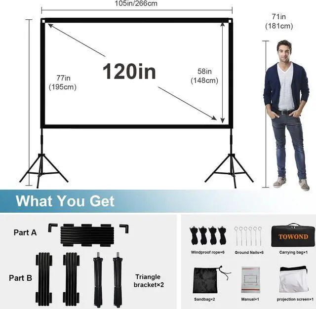 Easy to Assemble and Disassemble: The outdoor projector screen with stand includes an instruction manual for easy and quick setup in just a few steps. The detachable crossbar can be can be assembled easily without screws and tools, and the tripod can be opened quickly. Great for rapidly transferring places with less time.