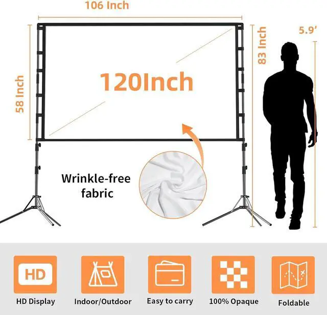 Wrinkle-Free Movie Screen: 120 inch projector screen, 16:9 format, 160° Wide Viewing Angle. screen for projector is made of polyester milk silk, thicker than other ordinary screens. but not see through. The movie projector screen is foldable, washable and soft, so it is very easy to clean from stains. Thick and Wrinkle-Free design giving you more fun, even support FRONT and REAR projection.