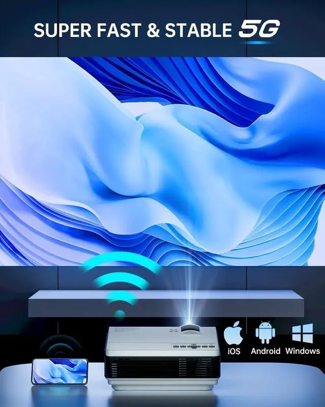 FASTER & STABLE 5G/ 2.4G DUAL-BAND WIFI & BLUETOOTH 5.2 CONNECTION Enjoy fast and stable connections with the dual-band 5G/ 2.4G WiFi and Bluetooth capabilities of our projector. Whether you're streaming content, playing games, or connecting external devices, you can count on seamless performance without any buffering or lagging issues.