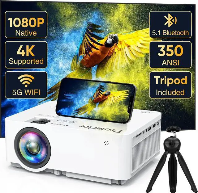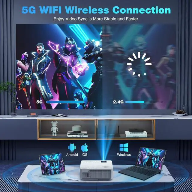 ***Latest 5G WIFI with Portable Tripod***With latest WiFi connection technology, this WIFI projector enables Android/IOS/Laptop device to synchronize screen mirroring by both 2.4G and 5G WiFi, Ultra-fast 5G WiFi offer you a much smoother, stable, and lag-free online videos/Gaming/Microsoft APP playing experience. (Copyright videos like Netflix and more need to be connected to a TV stick (not included) or HDMI cable to watch)