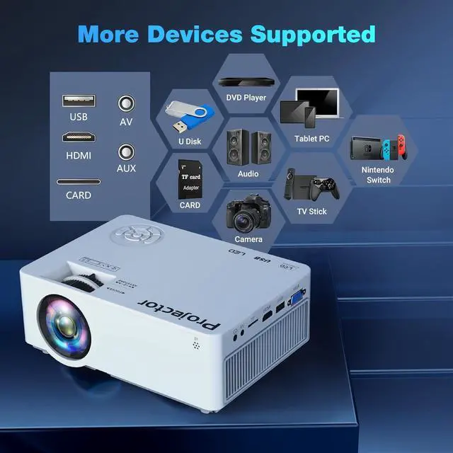 ***Multiple Connection for All Home Entertainment***This movie projector with WIFI and bluetooth is also equipped with HDMI/USB/AV/SD port which can properly compatible with TV stick, Smartphone, Tablet, Laptop, Video Games, USB stick, micro USB card, etc. to expand your home entertainment for more fun and colorful. This home proyector provides flexibility and fidelity images for our customers indoor and outdoor movies.