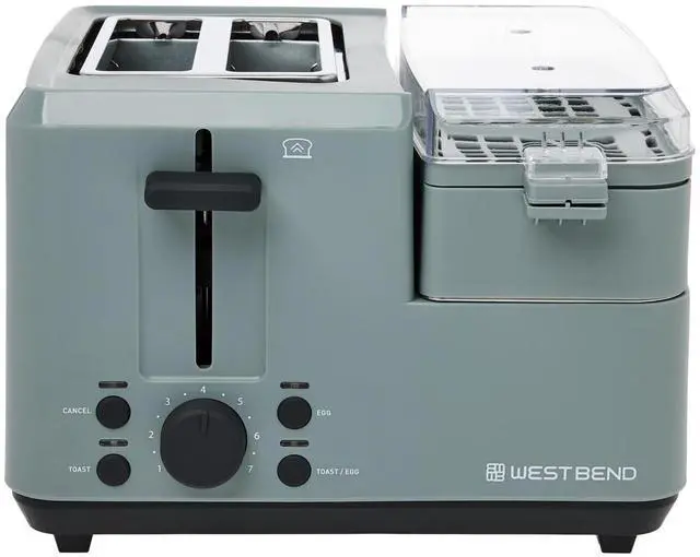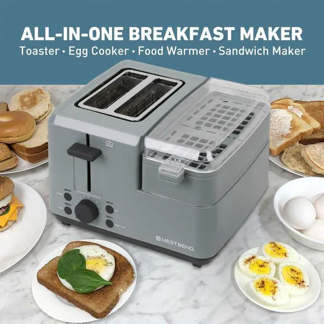 The West Bend breakfast station for eggs and muffins, with a two-slot toaster, is a single compact breakfast station. It toasts a variety of breads, English muffins, bagels, and croissants. With a high-toast lift, it makes removal of smaller bread types quick, easy, and safe. Also includes a color selection? from light to dark. Designed with two poaching trays and a meat warming tray to heat precooked meats, tomatoes, or pineapple slices. The egg and muffin breakfast station toaster can be used solely as a full functioning toaster and poacher or can be used simultaneously to make the ultimate breakfast sandwich in minutes.