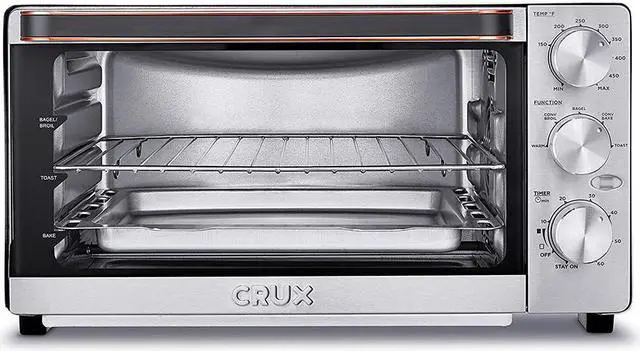 The grill rack can be moved into 3 different positions for your convenience. Set the user-friendly timer up to 60 minutes or utilize the stay-on feature. Built with safety, the countertop convection toaster oven also has an automatic shut-off feature. After playing chef master, the dishwasher safe crumb tray slides out easily to make cleanup quick and efficient. Spend extra time with your family appreciating your cooked meal with the help of the Crux 14543-SN 6-Slice Convection Toaster Oven.
