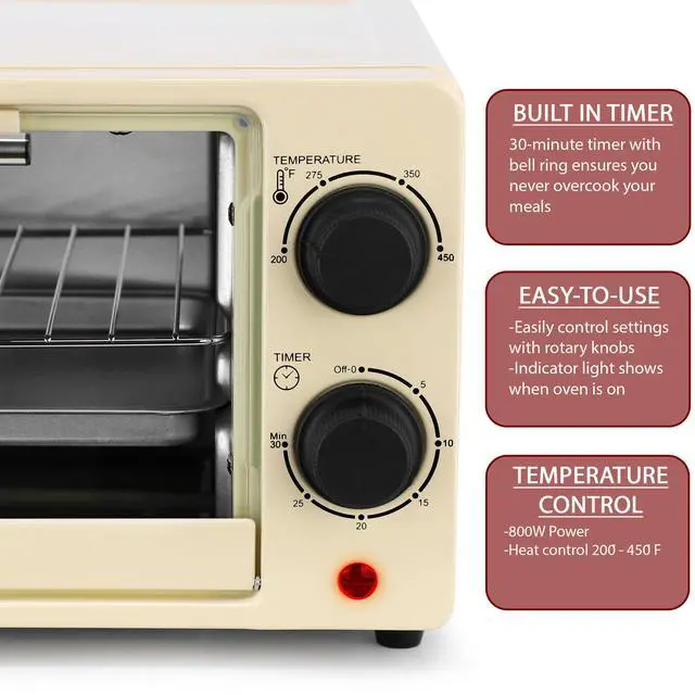The oven features a 30-minute timer with a bell ring, ensuring you can keep track of your cooking times with ease. An indicator light provides a clear visual cue when the oven is in operation. Finished in a stylish black color, it adds a modern touch to any kitchen decor. Included accessories, such as the bake tray and wire rack, enhance your cooking versatility and make cleanup a breeze. The MegaChef 9.5 Quart Compact Countertop Oven combines functionality and style, making it a valuable addition to any kitchen.