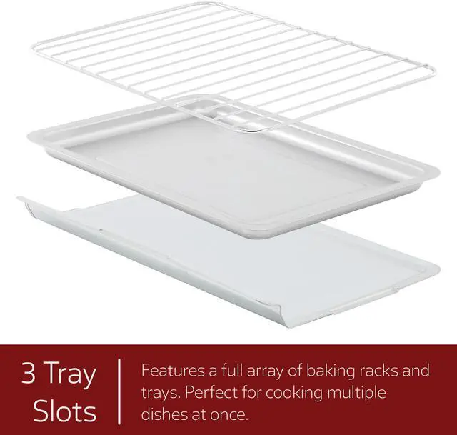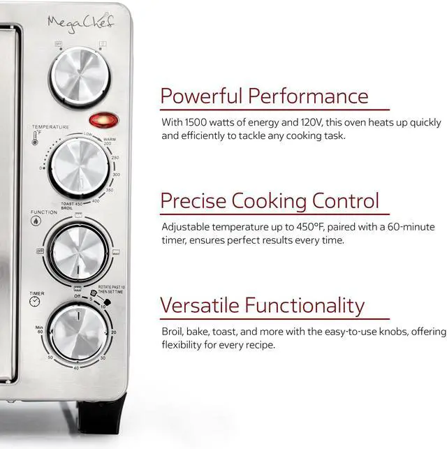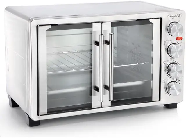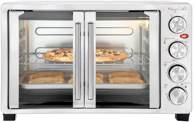 Featuring a sleek, fully stainless steel design and a French door opening, this oven combines style with practicality. The four-piece stainless steel heating elements ensure even heat distribution for superior cooking performance. The intuitive function switch offers settings for broil, bake, and toast, while the internal lamp provides clear visibility of your food as it cooks. Included accessories-an aluminum bake tray, wire rack, and crumb tray-enhance your cooking experience and make cleanup a breeze. The MegaChef 31.7 Quart Electric Countertop Oven is the perfect blend of functionality and elegance, making it a valuable addition to any kitchen.