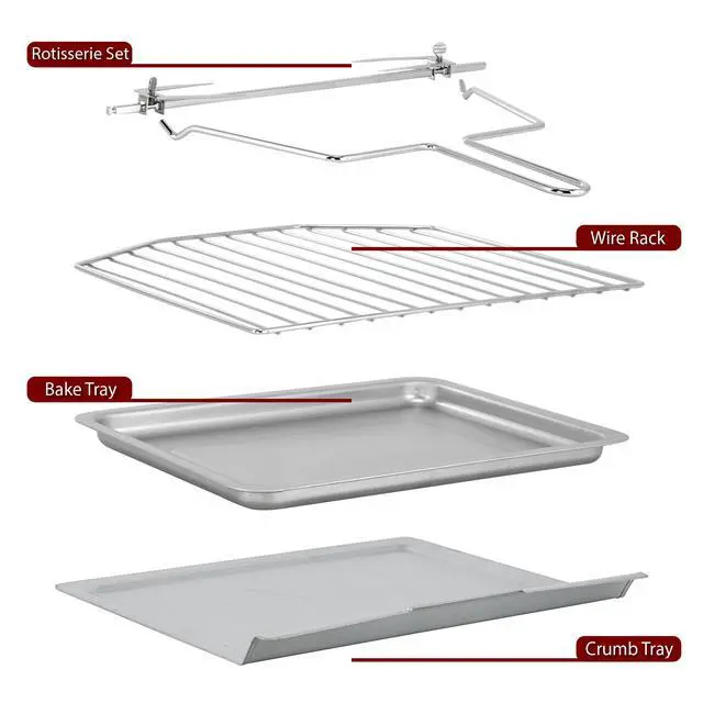 Included with the oven are essential accessories: an aluminum bake tray, wire rack, crumb tray, and rotisserie set, allowing you to start cooking right away. The fully stainless steel construction offers both durability and a sleek, modern look that complements any kitchen decor. This compact yet powerful oven fits comfortably on your countertop, combining functionality, style, and performance for all your cooking adventures.