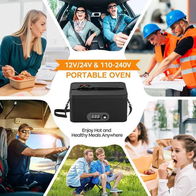 Portable Oven, 12V 24V 110V-240V Car Food Warmer Portable Personal Mini Oven Electric Heated Lunch Box for Meals Reheating & Raw Food Cooking for Road Trip/Camping/Picnic/Family Gathering(Black)